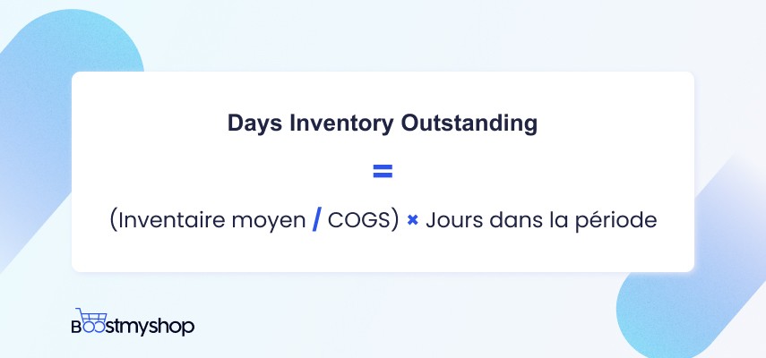 Le nombre de jours d’inventaire en cours peut être calculé à l’aide de la formule suivante : (Inventaire moyen / COGS) × Jours dans la période = DIO
